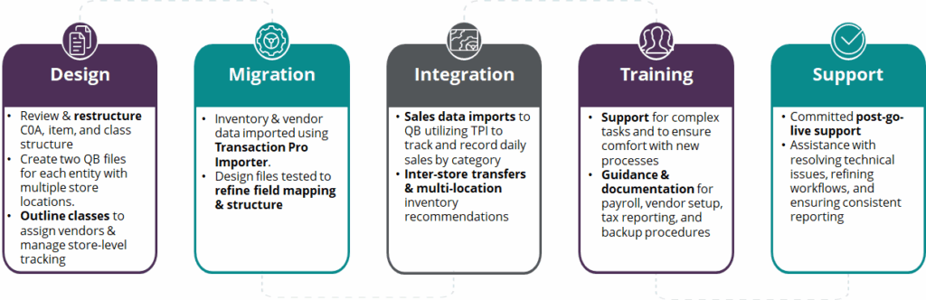 After evaluating the client’s operational complexity and scalability needs, Fourlane recommended QuickBooks Desktop Enterprise due to its robust inventory capabilities, customizable reporting, and advanced user permissions. The implementation involved a phased approach to ensure successful delivery: