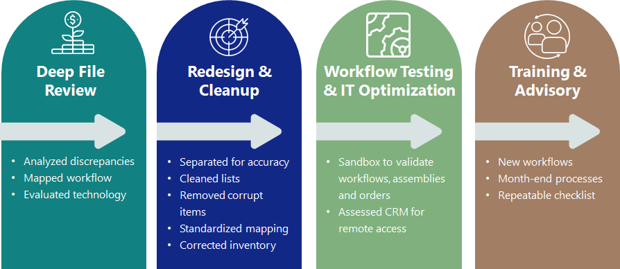 - Skewed financials from misposted inventory adjustments, inactive items with lingering values, and inconsistent COGS/income mapping